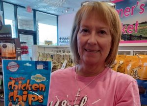 The bakery features freshly baked treats made with natural ingredients and have the cutest names—Snickerpoodles, Nutty Squirrels, Paw Lickin’ Chickens, Bacon Cheddar Bones, Beef Stew Stars, and Pumpkin Pie Fire Hydrants! Shelley gave our dogs cake samples, which they promptly “woofed” down. DELICIOUS! WGB has an entire wall dedicated to a variety of bagged dog treats. All but one brand is made in the USA; the exception is made in Canada. The best selling dog treat is Chicken Chips, AKA “dog crack.”